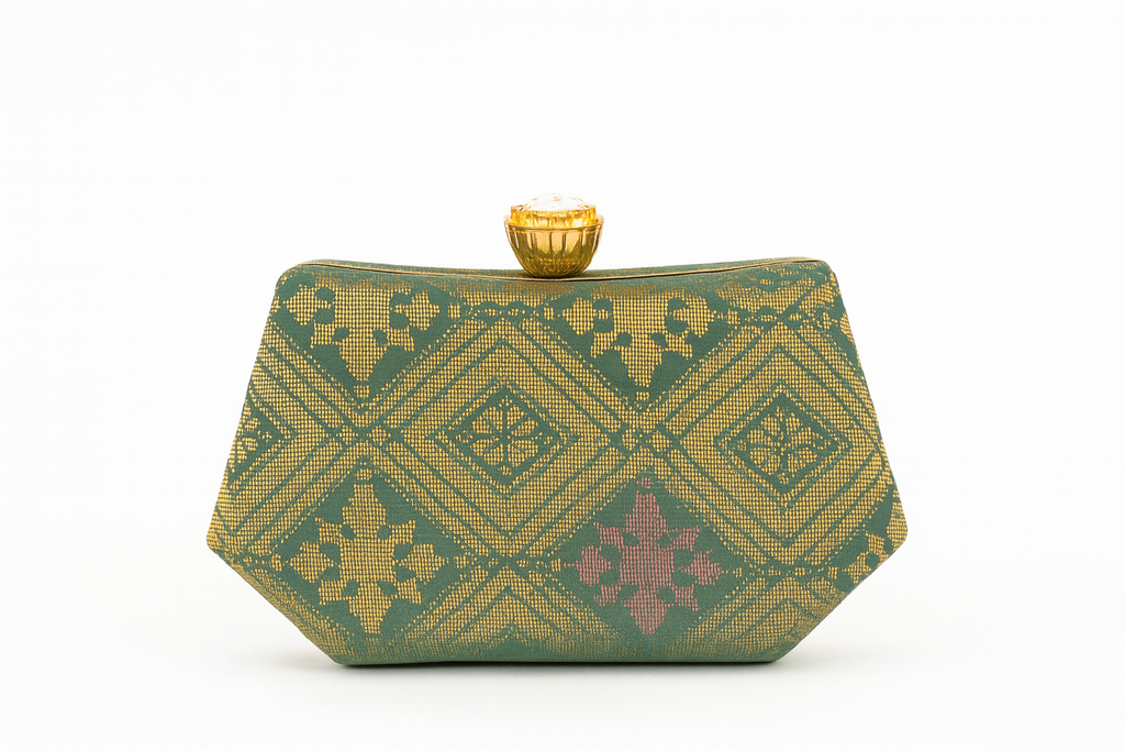 An elegant clamshell clutch using exclusive handwoven songket pieces by Bibah Songket. Heirloom songket pieces were used when making this clutch. This one-piece only clutch makes the ultimate handheld piece of heritage suitable for any occasion.