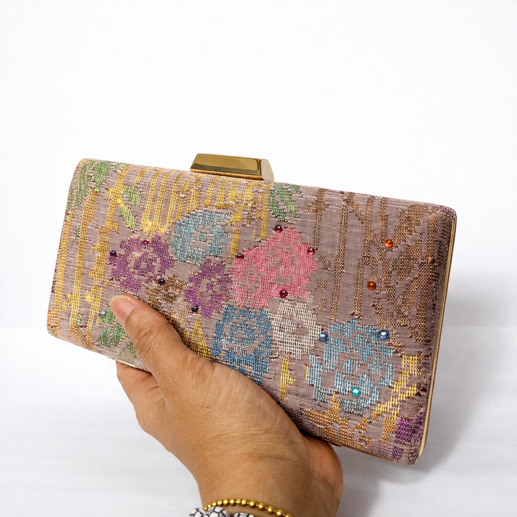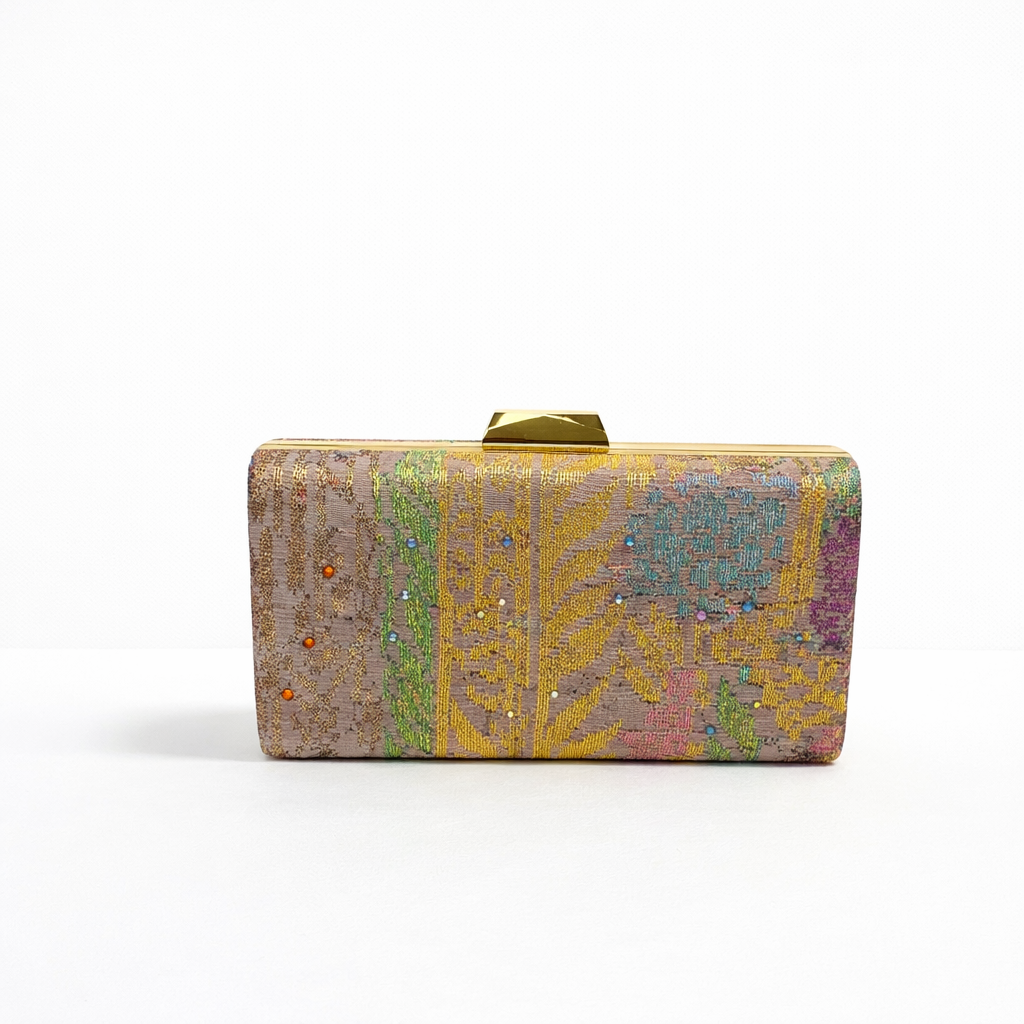An elegant clamshell clutch using exclusive handwoven songket pieces by Bibah Songket. Heirloom songket pieces were used when making this clutch. This one-piece only clutch makes the ultimate handheld piece of heritage suitable for any occasion.
