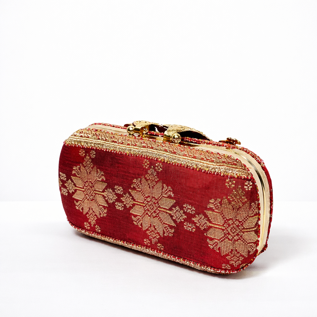 An elegant clamshell clutch using exclusive handwoven songket pieces by Bibah Songket. Heirloom songket pieces were used when making this clutch. This one-piece only clutch makes the ultimate handheld piece of heritage suitable for any occasion.