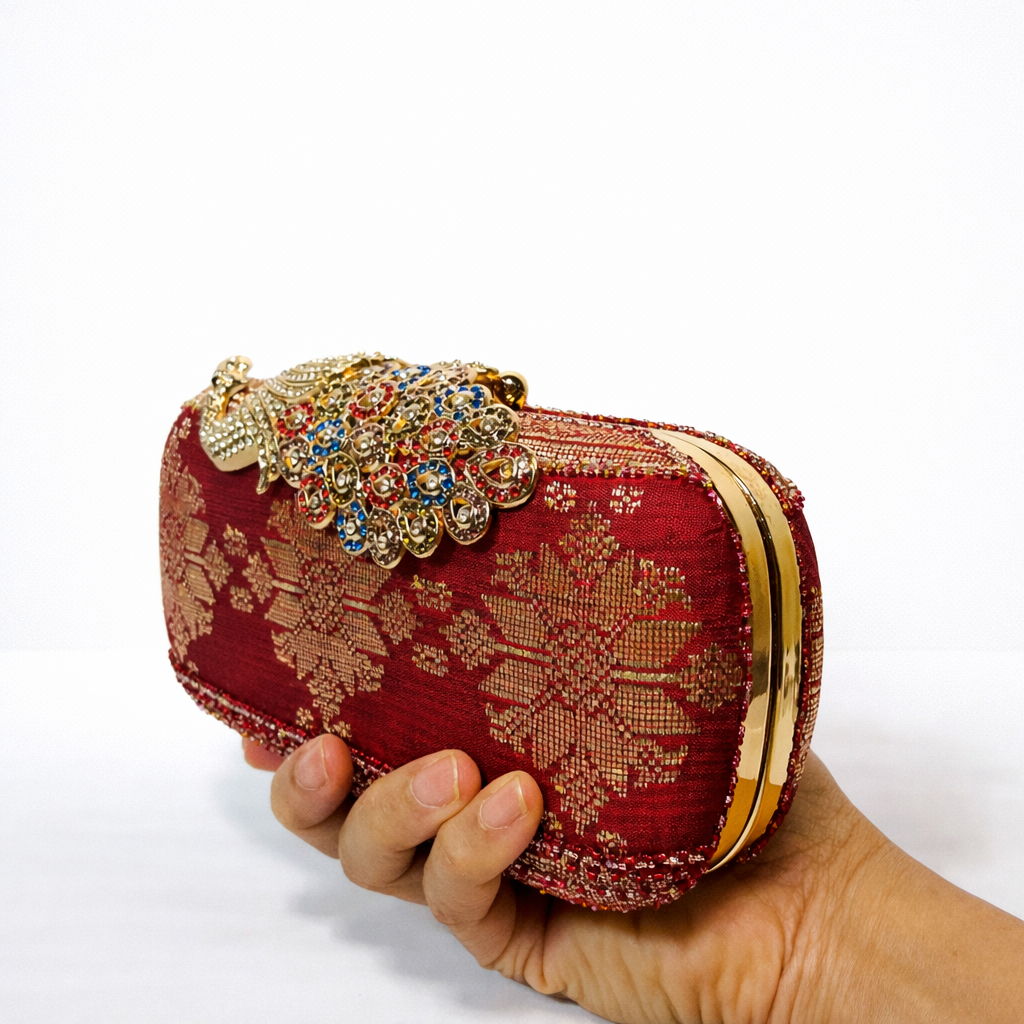 SONGKET CLUTCH = Traditional Dark Maroon Beaded Peacock=