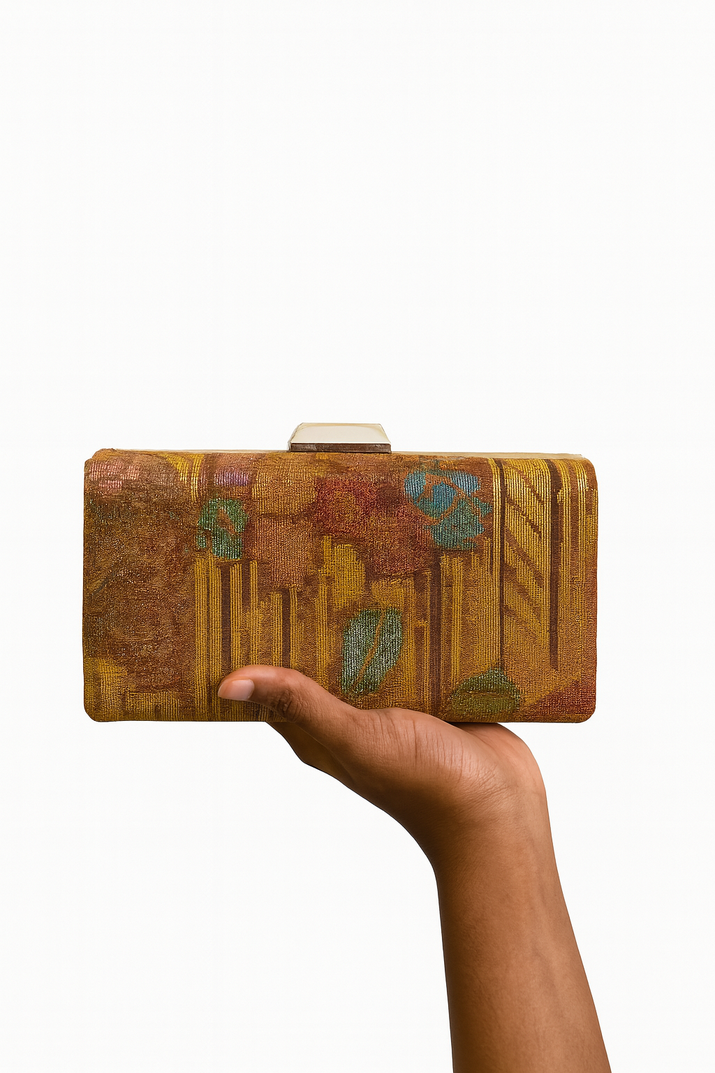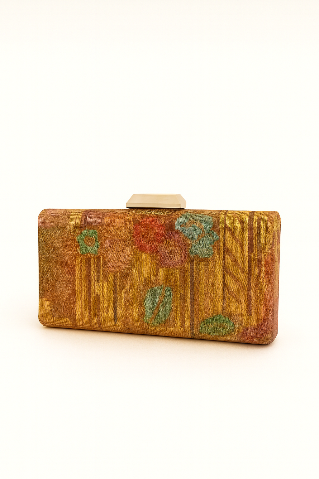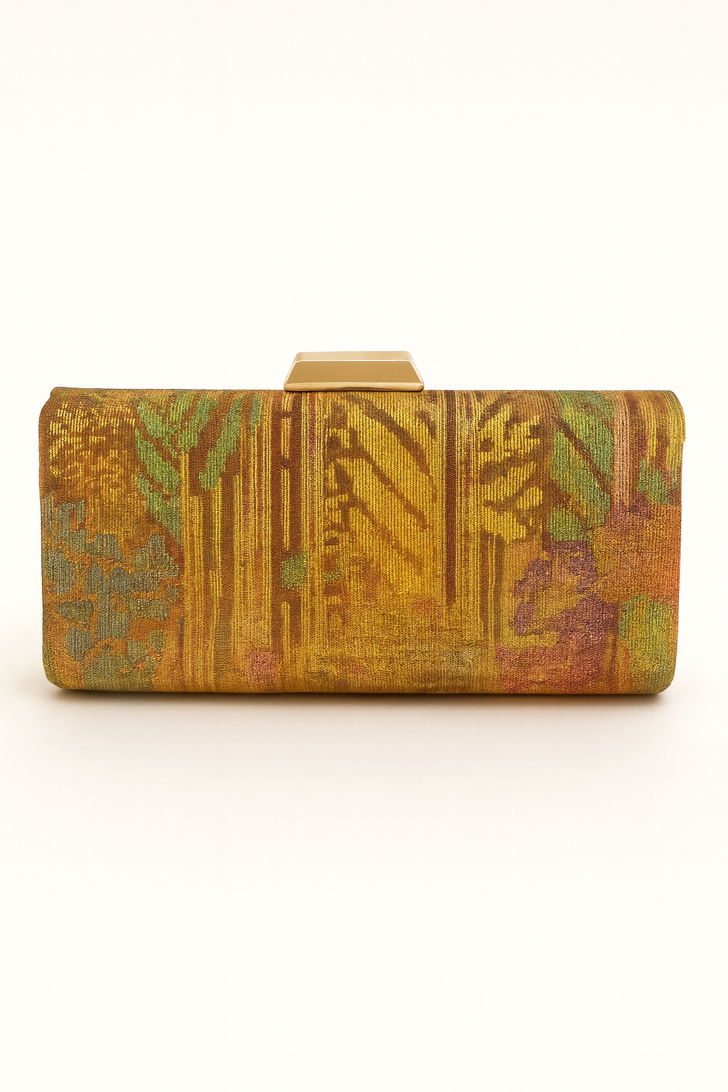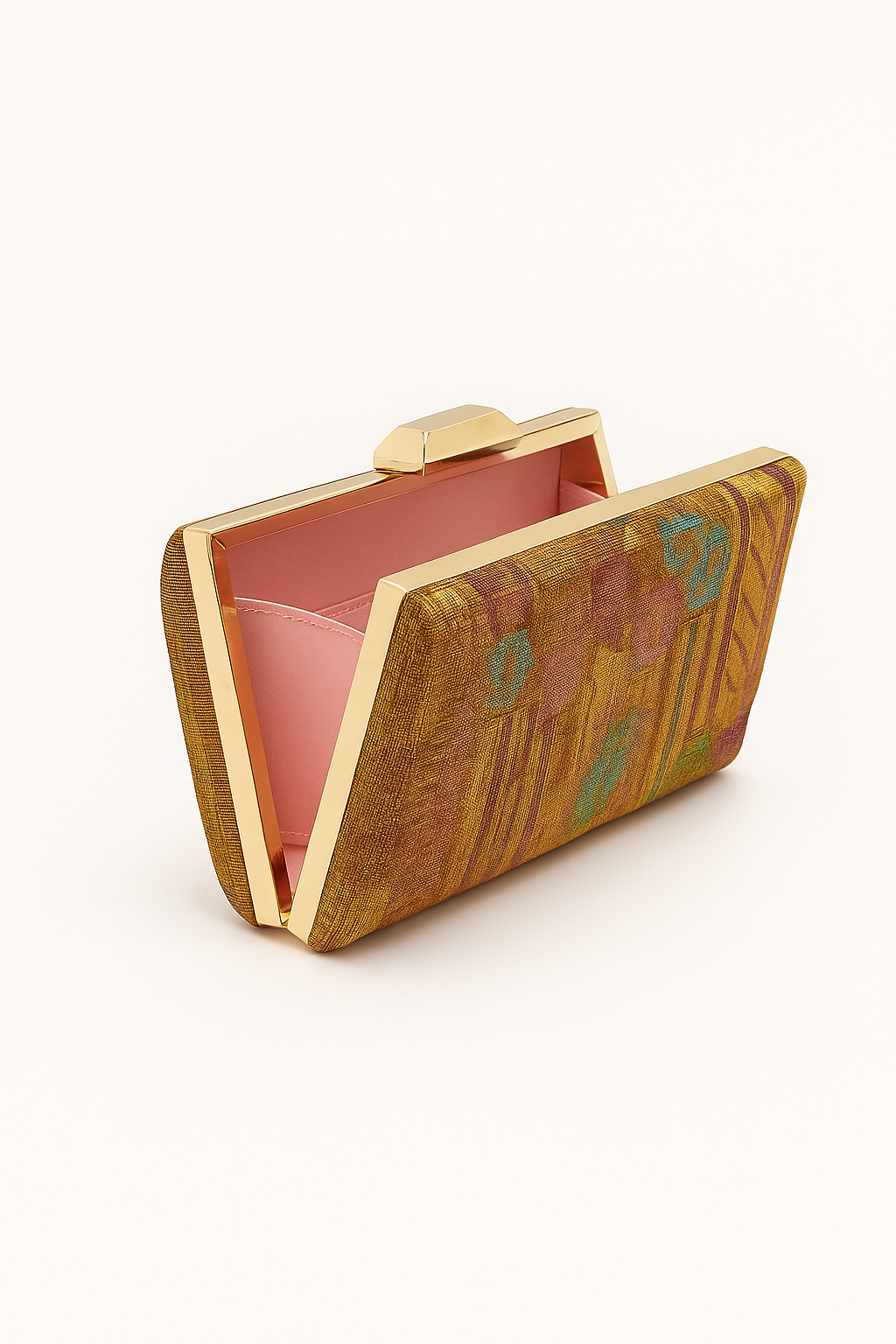 - Gold pouch shaped clamshell clutch